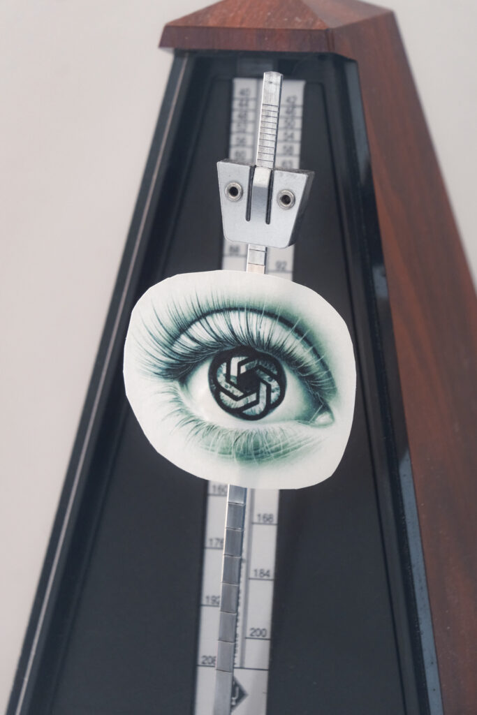 In Object of Desire (After Man Ray), I reimagine the Eye-Metronome as a mirror of the subjects our gaze is drawn to—those that dominate our visual world. The first edition, created in 2025, features an eye marked by the most prominent icon of the age of AI—an eye itself generated by artificial intelligence.