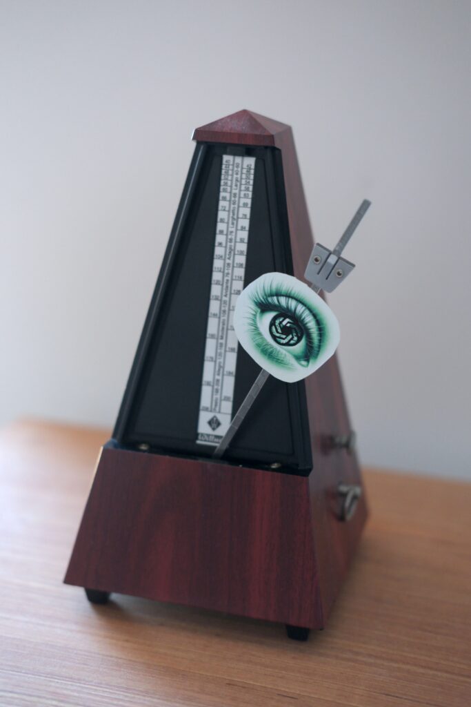Metronome with cutout image of eye on pendulum